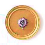 Pink flower with an eye and a hanging freshwater pearl inside a golden frame.